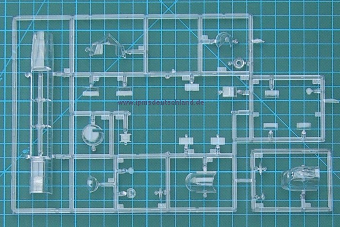 Die Glasteile des 72er Bausatzes zeigen, wie wenig TRUMPETER die Maße getroffen hat. Revell hat hier in den Proportionen und Abmaßen stimmige Teile geliefert. Es liegt dem Bausatz nur der große A-Stand für die DL-151 bei. Die Rumpfwanne besteht im Wesentlichen aus einem Klarsichtteil. Das lästige und fummelige Einsetzen der Fenster (wie noch bei der Ju 290) entfällt hier. Gut gemacht!