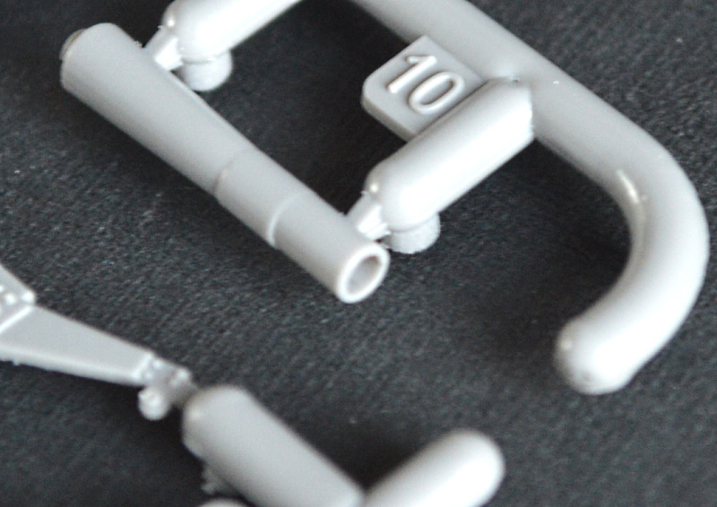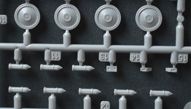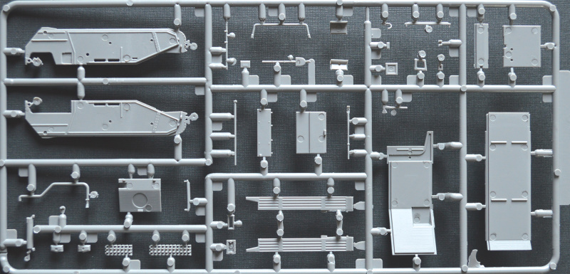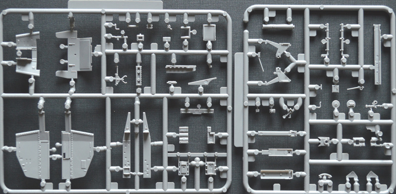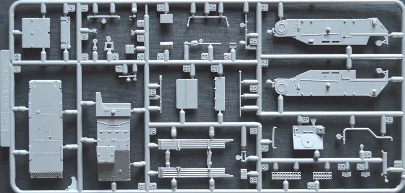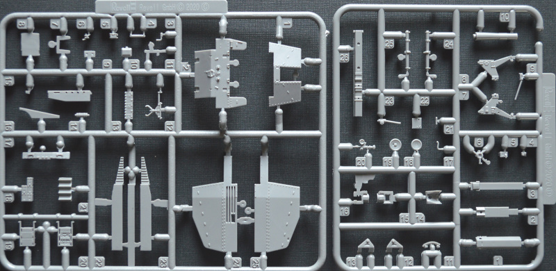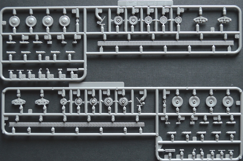 In dem für Revell typisch bunten, aber instabilen Faltkarton befinden sich 150 Teile auf fünf graue Spritzlinge verteilt, die Bau- und Bemalungsanleitung sowie die Decals. Die Abspritzung und Sauberkeit der Gussrahmen sind okay. Es gibt vereinzelte Sinkstellen im Bereich der Rahmen und ein paar Fischhäute. Die zahlreichen Auswerfermarken befinden sich allesamt in nicht sichtbaren Bereichen. Lediglich in den Ketten zwischen den Führungszähnen befinden sich kleine Marken, die durch die Zähne und Laufrollen aber schwer einsehbar sind. Insgesamt sollte die Versäuberung der Teile nicht allzu viel Zeit in Anspruch nehmen. Die Detaillierung ist wirklich gut gemacht. Die Kanone und der Auspuff sind dank Slide-Mold offen dargestellt. In meinem Fall ist der Auspuff aber nur leicht geprägt worden, sodass er trotzdem aufgebohrt werden muss. Der Kampfraum ist typisch für Spritzguss etwas vereinfacht dargestellt, bietet aber eine gute Grundlage. Trittbleche und Nieten sind deutlich sichtbar wiedergegeben, wirken aber nicht übertrieben.