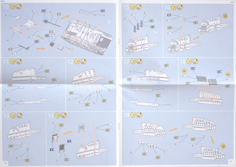 Der Bau beginnt mit der Wanne bzw. dem Laufwerk. Die stark vereinfachten Federblöcke sind leider ohne Struktur wiedergegeben, werden aber durch die Laufrollen verdeckt. Die einteiligen Ketten sollen nach dem Versäubern gebogen werden, wie man es bereits von anderen Revell-Modellen kennt. Die Kiste aus Lochblech (Teile A13, 14, 34, 35) auf dem linken Fender, die Auspuffabdeckung und das Gitter an der rechten Außenseite sind im Spritzguss nur vereinfacht wiedergeben. Hier empfehle ich Ätzteile zu nutzen oder wenigstens die Löcher aufzubohren bzw. das Gitter dünner zu schleifen. Die Antenne, Spriegel und Griffe an dem Ableitblech unterhalb des Geschützes sind maßstäblich natürlich zu dick. Hier kann man mittels Draht oder gezogenem Gussast Abhilfe schaffen. Positiv zu erwähnen sind die nicht-angegossenen Werkzeuge, das mehrteilige Funkgerät und die einzelnen Granaten, die dem Modell einen wesentlich plastischeren Eindruck verleihen. Der Munitionsbestand ist komplett aufgefüllt. Wer einzelne Halterungen leer darstellen möchte, muss einige Umbauten in Kauf nehmen. Das Geschütz bleibt beweglich. Sinnvoll wäre es, die Heckklappe für einen Feuerkampf abzuklappen. In der Anleitung wird sie zwar geschlossen befestigt, sie lässt sich aber auch im geöffneten Zustand ankleben. Zubehörsets, insbesondere Ätzteile, speziell für dieses Modell sind mir keine bekannt. Für das sIG 33 und die Pz.Kpfw. 38(t)-Varianten anderer Hersteller sind aber schon einige Sets erschienen, die sich mit etwas Nacharbeit sicherlich auch für diese Grille nutzen lassen.