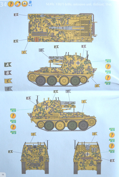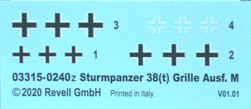 Die Bauanleitung ist typisch für Revell. Infos zum Vorbild gibt es leider keine mehr, dafür sind die einzelnen Arbeitsschritte leicht nachzuvollziehen und Besonderheiten wie z. B. das Aufbohren von Teilen werden deutlich dargestellt. Revell bietet leider nur zwei fast identische Bemalungsvarianten an, wobei es sich um dunkelgelbe Grundfarbe mit braunen und grünen Tupfen handelt, in einem Fall mit grauem Rohr. Die Einheiten sind unbekannt, nur irgendwie von der Ostfront 1945! Selbst die Wintertarnung des von Revell gebauten Modells wird nirgends erwähnt. Merkwürdigerweise werden dazu vier verschiedene Balkenkreuzstile/-größen angeboten. Auf mich wirken die angebotenen Bemalungen sehr einfallslos, zumal man im Internet recht schnell auch andere attraktive Fahrzeuge mit Markierungen findet. Hier wurde eine gute Chance für schöne Decals vertan. Immerhin wandern mehrere dünn und fehlerfrei gedruckte Balkenkreuze in die Restekiste.