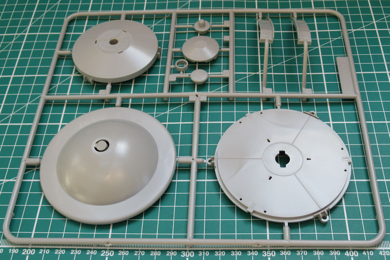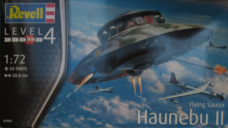 Bausatz: Revell liefert einen zugekauften Beitrag zum Thema Haunebu II. Dieser Bausatz ist lt. Verpackung im Maßstab 1/72 gehalten. Nimmt man die 26,30 Meter als Maß, dann kommt man auf gut 32 cm. Das passt hier so rein gar nicht. Hier hat sich der Auftraggeber der Form wohl etwas vertan… Aber Wave hatte den gleichen Maßstab als Verkaufsargument genutzt. Bei einem fiktiven Vorbild ist das eher nebensächlich.