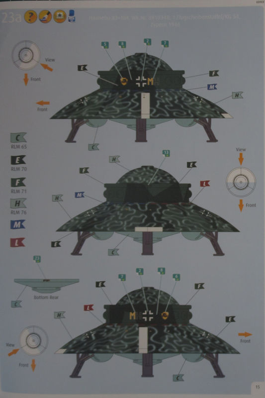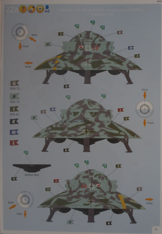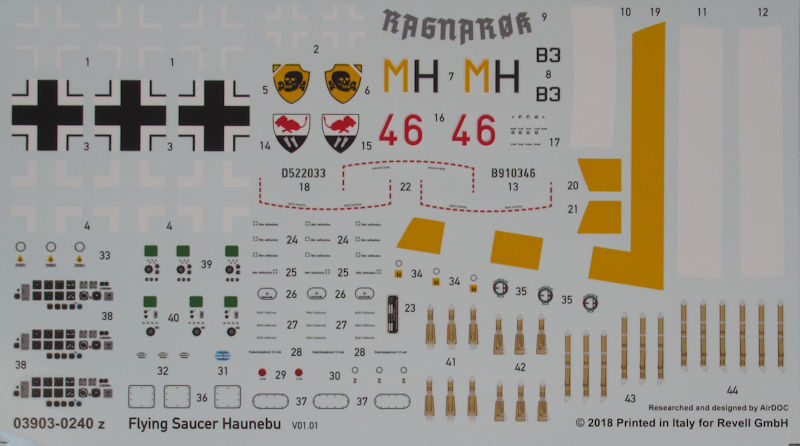 Bei der Bemalung des fantasievollen Haunebu II hält man sich an die Flugzeuge der Deutschen Luftwaffe aus den 1940er Jahren… Verwiesen wird auf das eigene Farbsystem. Der Decalbogen enthält auch eine Menge Wartungshinweise sowie Instrumentenbords.