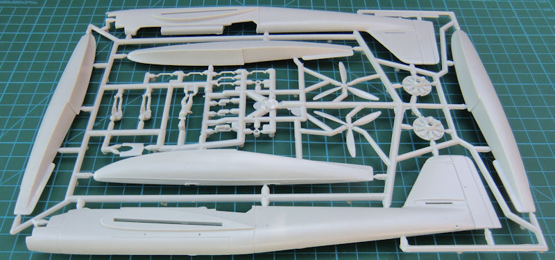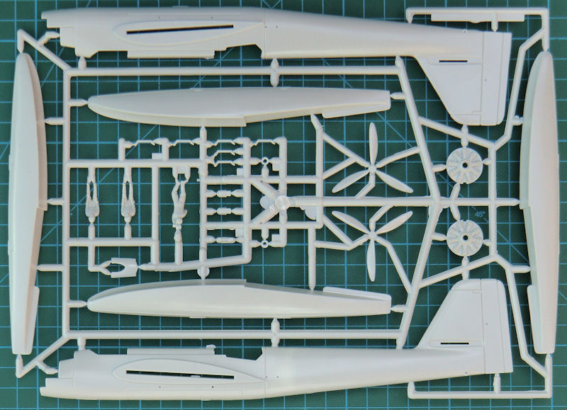In der Schüttbox befinden sich gut verpackt drei hellgraue Spritzgussrahmen mit nur 54 Teilen, ein Klarsichtrahmen mit fünf Teilen, ein Decalbogen und die übersichtliche Bauanleitung. Tja leider erkennt man, dass die Form des Bausatzes schon ein paar Tage alt ist. Die Oberfläche bietet wenig Details aber feine erhabene Strukturen. Die Klarsichtteile sind recht dick und nicht besonders durchsichtig. Das Cockpit verdient diese Bezeichnung nicht. Es gibt eine Grundplatte mit zwei Sitzen und zwei Pilotenfiguren. Leider hat bisher der Zubehörmarkt auch nichts zur Besserung der Lage beigetragen. Da hilft der im Bug vorhandene Torpedoschütze auch nicht weiter.