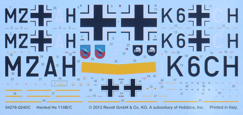Der Decalbogen ist der Höhepunkt des Bausatzes. Dieser ist tadellos im Register auf hellblauem Trägerpapier gedruckt. Leider finde ich die Revell-Bemalungshinweise nicht mehr zeitgemäß. Das ganze ist in s/w und bei den Farbhinweisen soll wieder gemixt werden. Hier hatte man schon mal RLM-Farbtöne angegeben. Auf der Tragflächenoberseite sind die Hinweise zum Anbringen der Decals recht unübersichtlich.