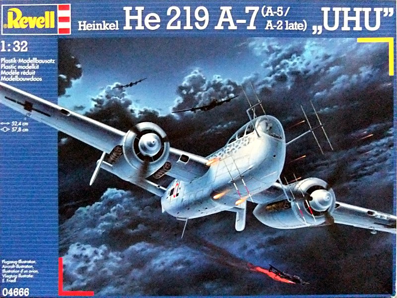 Bausatz: Bei uns ist nun der "Uhu" aus dem Sack, bzw. aus dem Karton. Und der ist praktischerweise ein Stülpkarton, in dem während des Zusammenbaus der rund 270 Einzelteile diese bequem zwischengelagert werden können. Revell ermöglicht die Baureihen A-2, A-5 und A-7 aus dem Bausatz zu bauen. Dafür sind alle benötigten Alternativteile vorhanden. Die Besonderheit eines Exemplars der He 219 A-7 ist ein Aufsatz auf der Pilotenkanzel, welcher das Naxos Messgerät beherbergt. Für diese Maschine ist dann die Funkmessantenne FuG 350 zu verwenden. Diese Maschine, war 1945 auf Westerland/Sylt stationiert.