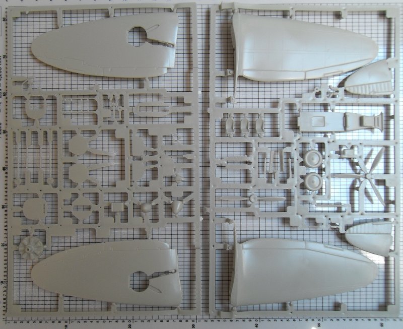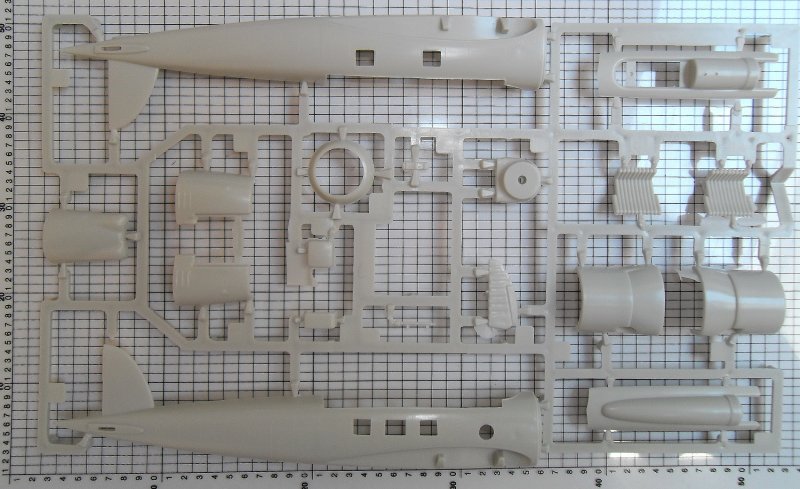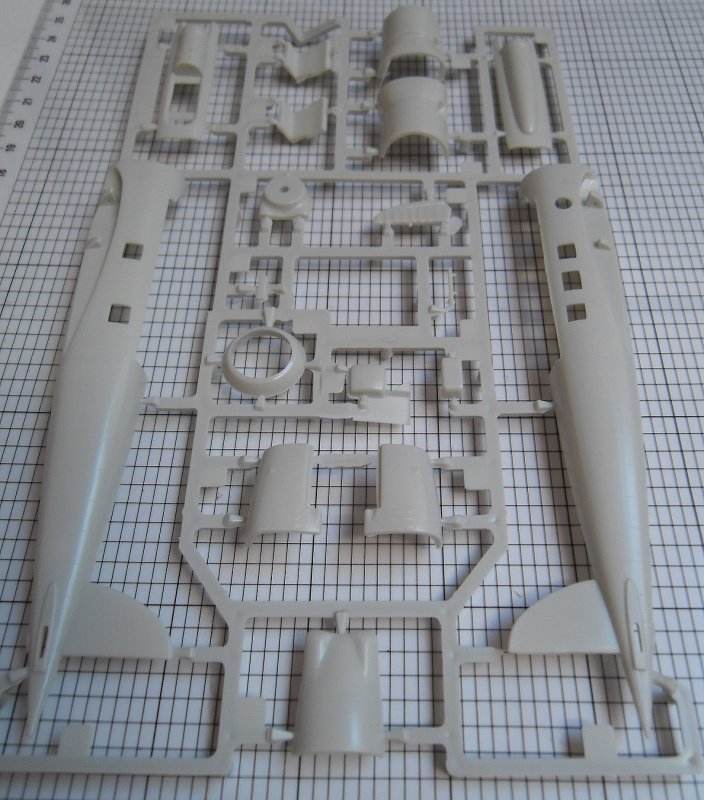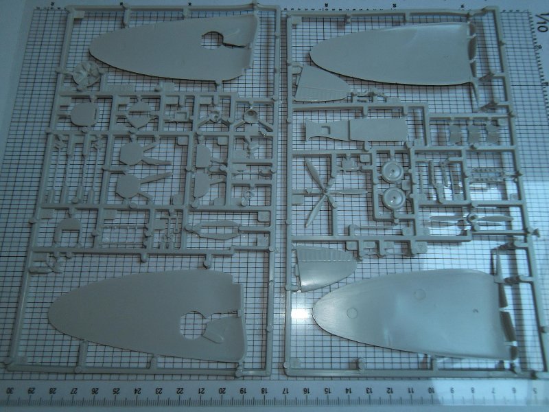Das eigentliche Problem dieses Bausatzs liegt nicht im Mangel an eingravierten Oberflächendetails oder an einer fehlenden Cockpiteinrichtung, sondern vielmehr in einer etwas zu bescheidenen Gussqualität. Welche einen "verwaschenen" Eindruck macht und auch ein paar Sinkstellen bereithält. Auch sind die Angussstege recht ungünstig angebracht worden da sie teilweise an den Ecken liegen und daher schwer mit dem Seitenschneider abzutrennen sind. Hinzu kommt das die grau-beige Kunststoffmischung etwas spröde ist, so daß es beim Abschneiden der Teile vom Gussrahmen aufzupassen gilt.