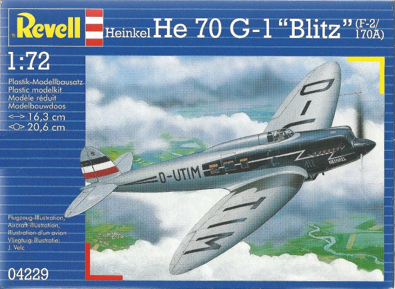 Verpackt wurde dieser bei seinem Erscheinen noch einzige Bausatz einer He 70 in eine viel zu kleinen Karton der nicht einmal eine Fotografie des fertigen Modells auf den Seitenwänden besitz und von den Dimensionen von anderen Revell-Flugzeugmodellen Verpackungen abweicht. Das Deckelbbild stammt übrigens von Jaroslav Velc den die ältern Modellbau-Kollegen noch von KP Kopro kennen dürften und der sich in der Tschechoslowakei nebenbei auch noch als Grafiker vieler Profiles einen Namen gemacht hat.