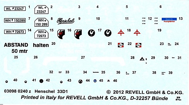 Der umfangreiche Decalbogen enthält nicht nur die Markierungen für drei Einsatzvarianten, sondern auch noch diverse Beschriftungen für das Fahrzeug und für die Instrumente des Armaturenbrettes.