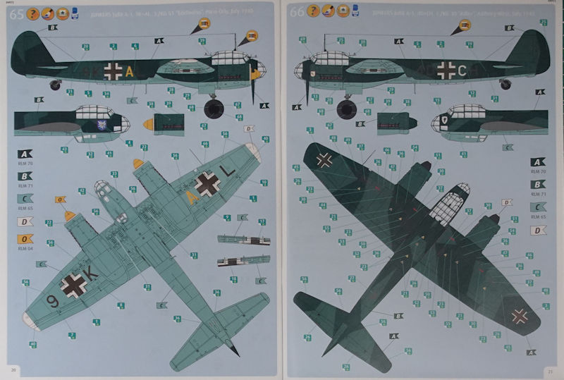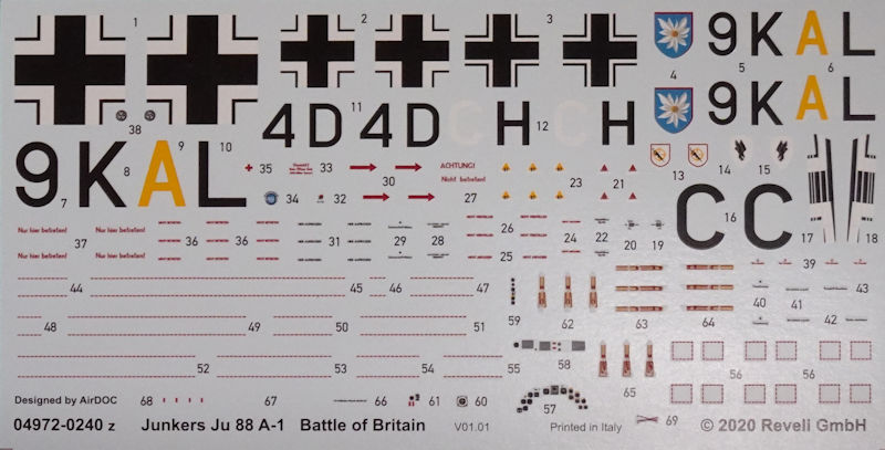 Die Farbanweise beziehen sich auf die hauseigenen Farbtöne. Für alle, die ein eigenes Farbsystem bevorzugen liefert Revell auch die RLM-Töne. Für die Bemalungsvarianten zeigt sich AirDOC verantwortlich. Der Decalbogen ist fast perfekt gedruckt. Allerdings ist aus den Oktandreiecken die 87 nach unten gewandert.