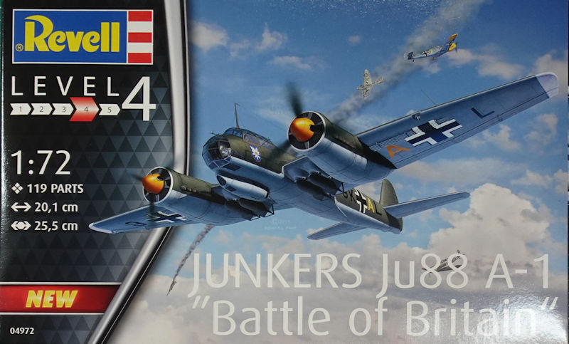 Bausatz: 2011 erschien die Ju 88A-4 aus neuen Formen im Maßstab 1/72 bei Revell. Danach folgte noch die C-Variante und dann war leider erstmal Ruhe. Die Form bietet noch Potential für weitere Varianten aber nun gibt es erstmals eine A-1 im Maßstab 1/72! In der attraktiven aber deutlich zu großen Schüttbox zehn (!) hellgraue Spritzlinge mit 104 Teilen, zwei klare Spritzlinge mit 15 Teilen, ein Decalbogen und die mehrfarbige Bau- und Bemalungsanleitung.
