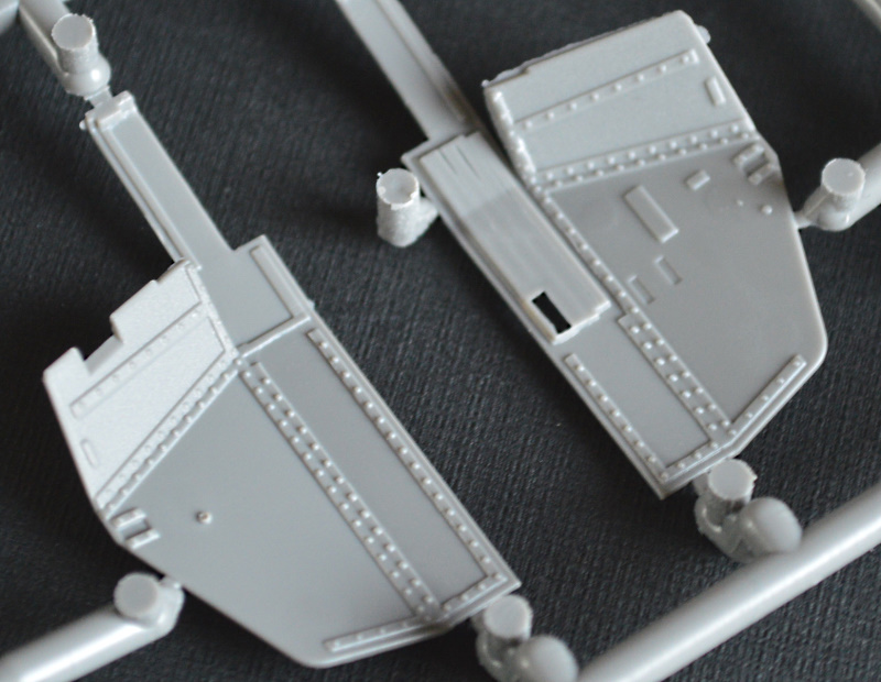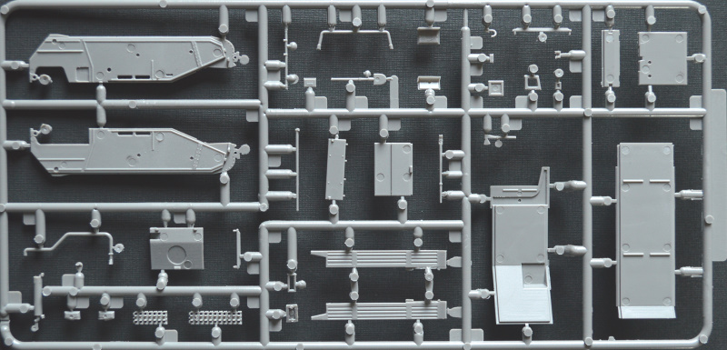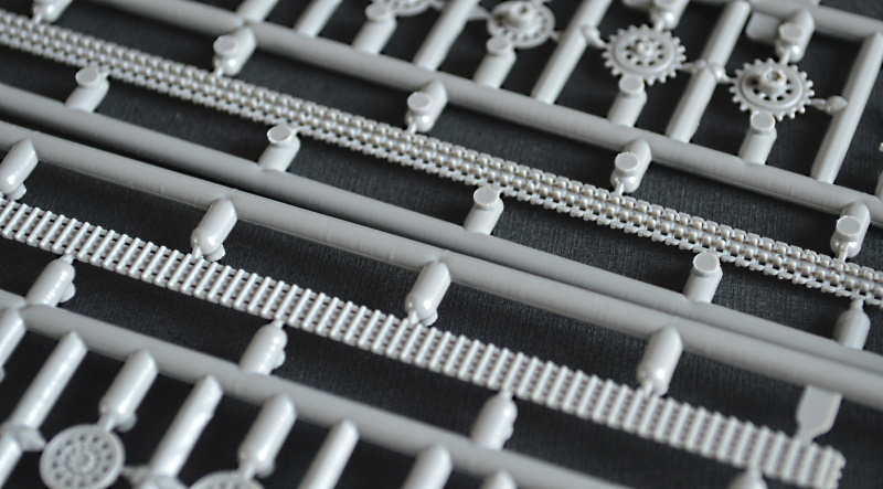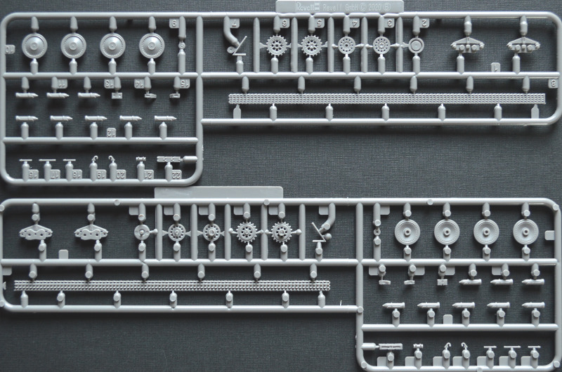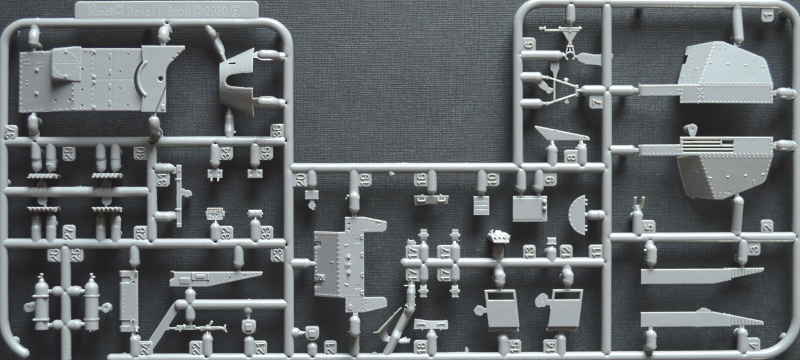 In dem für Revell typisch bunten, aber instabilen Faltkarton befinden sich 138 Teile auf fünf graue Spritzlinge verteilt, die Bau- und Bemalungsanleitung sowie die Decals. Weitere Teile stammen noch von dem Grille-Bausatz und wandern in die Restekiste. Die Abspritzung und Sauberkeit der Gussrahmen sind okay. Es gibt vereinzelte Sinkstellen im Bereich der Rahmen und ein paar Fischhäute. Die zahlreichen Auswerfermarken befinden sich allesamt in nicht sichtbaren Bereichen. Lediglich in den Ketten zwischen den Führungszähnen befinden sich kleine Marken, die durch die Zähne und Laufrollen aber schwer einsehbar sind. Insgesamt sollte die Versäuberung der Teile nicht allzu viel Zeit in Anspruch nehmen. Die Detaillierung ist wirklich gut gemacht. Die Kanone, die Behälter für den Gasantrieb und der Auspuff sind dank Slide-Mold offen dargestellt. In meinem Fall ist der Auspuff aber nur leicht geprägt worden, sodass er trotzdem aufgebohrt werden muss. Der Kampfraum ist typisch für Spritzguss etwas vereinfacht dargestellt, bietet aber eine gute Grundlage. Trittbleche und Nieten sind deutlich sichtbar wiedergegeben, wirken aber nicht übertrieben.