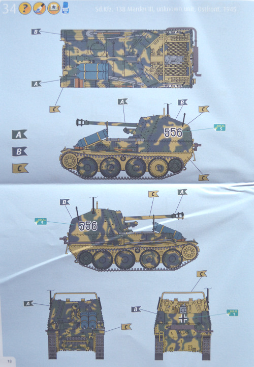 Der Bau beginnt mit der Wanne bzw. dem Laufwerk. Die stark vereinfachten Federblöcke sind leider ohne Struktur wiedergegeben, werden aber durch die Laufrollen verdeckt. Die einteiligen Ketten sollen nach dem Versäubern gebogen werden, wie man es bereits von anderen Revell-Modellen kennt. Die Bauanleitung sieht auf dem vorderen Wannendach die beiden Behälter für den Holzgasantrieb vor. Ich vermute, Toxso wollte dem Marder III etwas Besonderes gönnen und hat sie deswegen beigelegt. Fast alle mir bekannten Marder III-Bilder zeigen an dieser Stelle eine Ersatzkette, die auch als Teil 37 beiliegt. Für mich ist es nicht nachvollziehbar, warum Revell die Kette weglassen will und nicht als Option anbietet. Die Kiste aus Lochblech (Teile A13, 14, 34, 35) auf dem Fender, die Auspuffabdeckung und das Gitter an der rechten Außenseite sind im Spritzguss nur vereinfacht wiedergeben. Hier empfehle ich Ätzteile zu nutzen oder wenigstens die Löcher aufzubohren bzw. das Gitter dünner zu schleifen. Die Antenne, Spriegel und Griffe an den Ableitblechen unterhalb des Geschützes sind maßstäblich natürlich zu dick. Hier kann man mittels Draht oder gezogenem Gussast Abhilfe schaffen. Positiv zu erwähnen sind solche Details wie die nicht-angegossenen Werkzeuge und das mehrteilige Funkgerät, die dem Modell einen wesentlich plastischeren Eindruck verleihen. Das im Kampfraum befestigte MG ist zwar nicht das Beste, das ich in 1:72 gesehen habe, erfüllt aber seinen Zweck und trägt so zu einem lebendigen Aussehen bei. Die Munitionshalterungen sind auch enthalten, aber leider allesamt leer. Wer Granaten ergänzen möchte, muss erst die Halterungen ausreichend aufbohren und dann noch Granaten besorgen. Hier könnte der Zubehörmarkt reagieren. Das Geschütz bleibt beweglich. Die Heckklappe wird in der Anleitung zwar geschlossen befestigt, lässt sich aber auch im geöffneten Zustand ankleben. Zubehörsets, insbesondere Ätzteile, speziell für dieses Modell sind mir keine bekannt. Für die Pak 40/3 und die Pz.Kpfw. 38(t)-Varianten anderer Hersteller sind aber schon einige Sets erschienen, die sich mit etwas Nacharbeit sicher auch für diesen Marder III nutzen lassen.