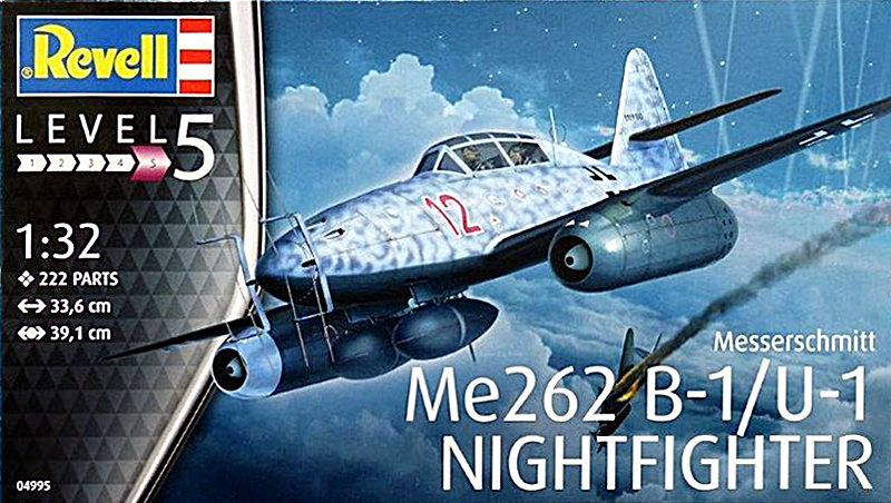 Bausatz: Nachdem Clubmitglied Peter Wiegmann die Me 262 B-1/U-1 von Revell schon aus einem frühen Testshot hervorragend gebaut hat und unser 1. Vorsitzender, Volker Helms, einen fast finalen Testshot im Oktober in Wort und Bild besprochen hat, kam der fertige Bausatz kurz vor dem Fest in die Modellbauläden. Der Bausatz ist in der typischen Revell Schüttbox verpackt. Ein attraktives Deckelbild ziert den Karton, der in dem jetzt schon bekannten neuen Verpackungsdesign gehalten ist. Unter dem Revell Logo prangt groß die Level Angabe 5, also ein Bausatz für den schon erfahrenen Modellbauer. Eine gerechtfertigte Einstufung, da der Bausatz, über 222 Einzelteile verfügt und recht komplex ist.
