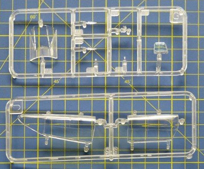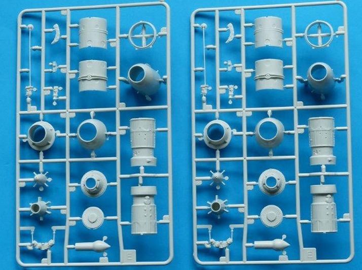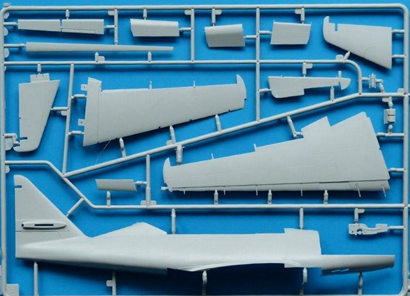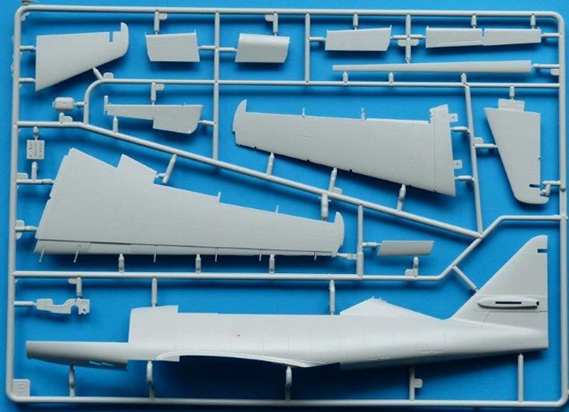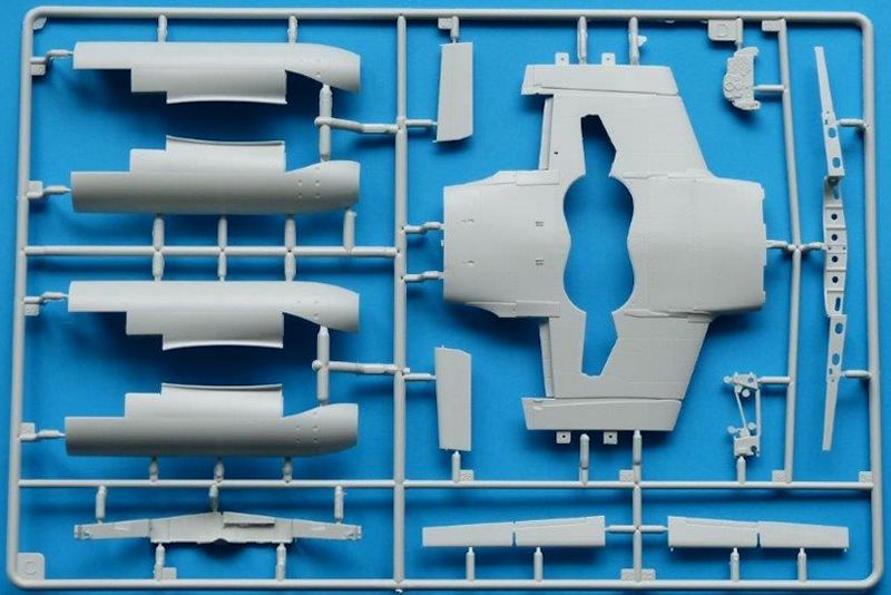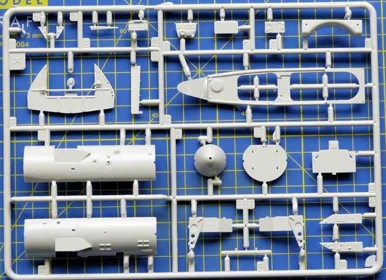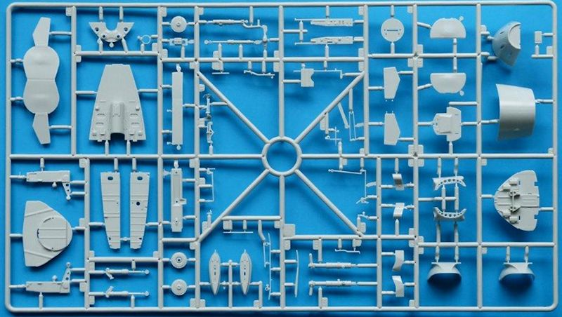 Im Karton liegen elf hellgraue Spritzlinge und zwei Klarsichtrahmen mit Cockpitkanzel, Positionsleuchten, Panzerglasscheibe und Revi 16B. Dazu kommen noch Decalbogen und die Bauanleitung. Alle Bausatzteile zeigen einen hohen Grad an Detaillierung. Grat an den Teilen ist nicht zu entfernen und alle Auswerfermarkierungen liegen so, dass sie am zusammengebauten Modell nicht mehr auffallen.
