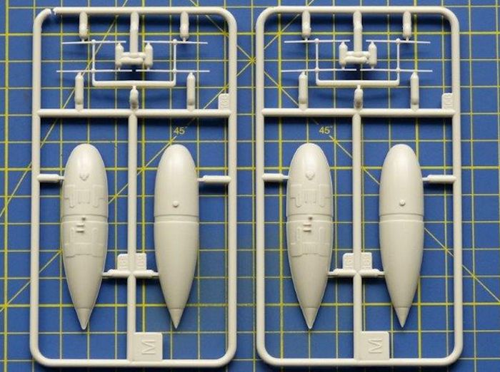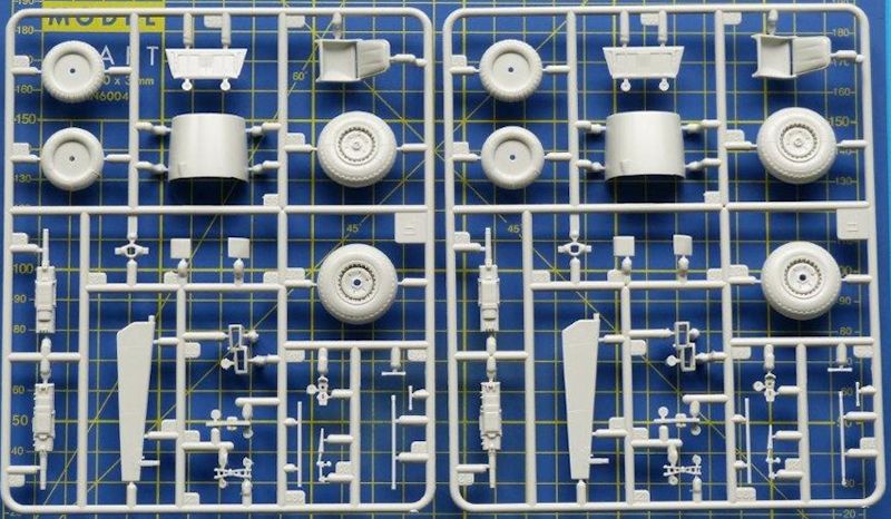 Sind die Tragflächen komplettiert und mit dem Rumpf verklebt geht es an den Zusammenbau der gut umgesetzten und detaillierten Jumo 004 Triebwerke. Jedes besteht aus mehreren Teilen. Da, nach Einbau des Triebwerks in der Verkleidung eine Wartungsklappe geöffnet werden kann, sollte sich man sich überlegen ob man das Triebwerk noch mit diversen Leitungen versieht. Auch das Fahrwerk zeigt auf der Höhe der Zeit. Die Reifen haben ein schönes Profil sind aber leider zweigeteilt sodass beim Zusammenkleben eine unschöne Naht entstehen könnte. Alle Fahrwerkklappen sind auch von innen sehr gut detailliert. Auch weisen die Klappen des Hauptfahrwerks die korrekten Wölbungen auf.