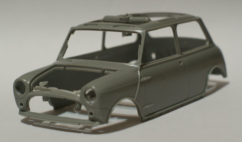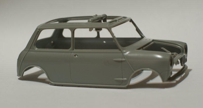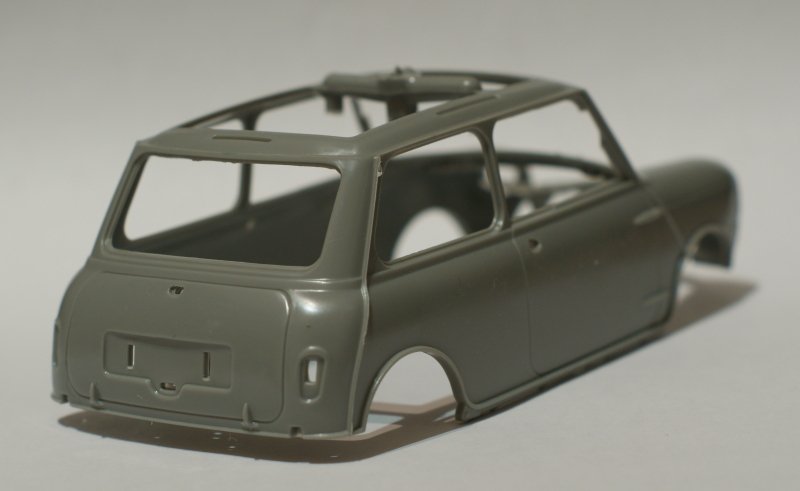 Wenn ich die Bauanleitung richtig gelesen habe läßt sich der Mini letztendlich aus drei großen Teilegruppen zusammenbauen: Interieur, Bodengruppe und Karosserie. Somit dürfte auch der im Umgang mit der Spritzpistole nicht so vertraute Modellbauer ohne große Abklebeorgie ein sauber lackiertes Modell hinkriegen.