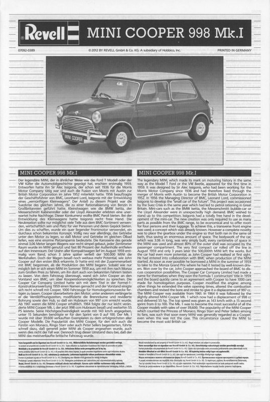 Über den Mini viele Worte zu verlieren dürfte nicht nötig sein. Hier verweise ich einfach auf die Bauanleitung von Revell. Nachdem Revell in der Geschichte des Minis erwähnt das Ringo Starr einen gefahren hat bekommt Mr. Beans Mini doch gedankliche Konkurenz.