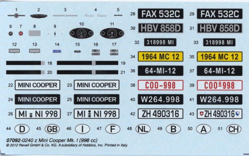 Der Decalbogen bietet für jeden der beiden Hersteller die entsprechenden Decals an. Revell hat sich die Mühe gemacht das Armaturenbrett in beiden Ausführungen beizufügen, wer also will kann einen linksgesteuerten Mini mit Meilentacho bauen.