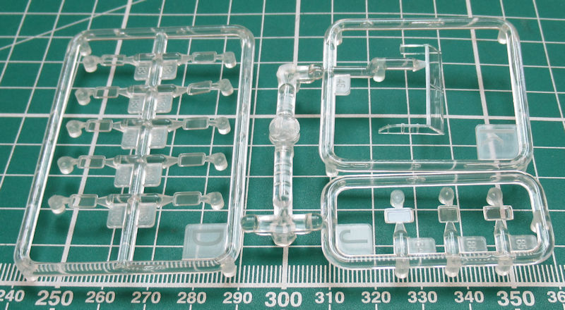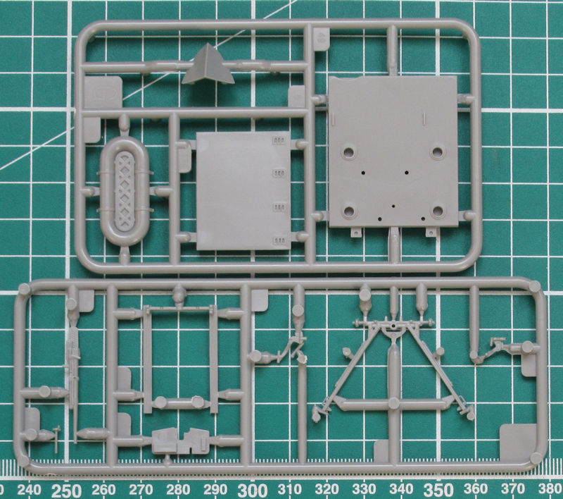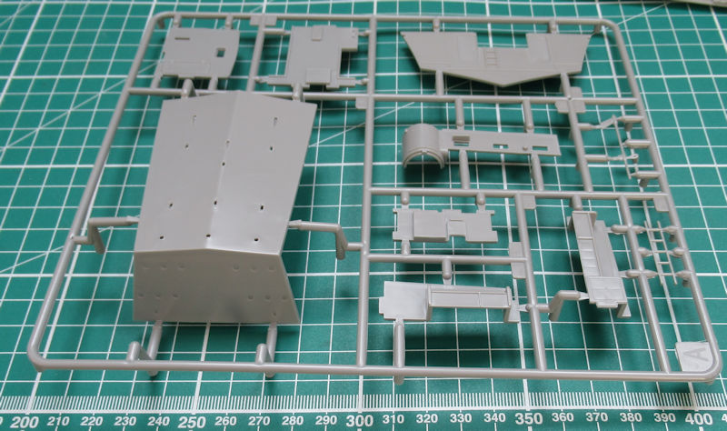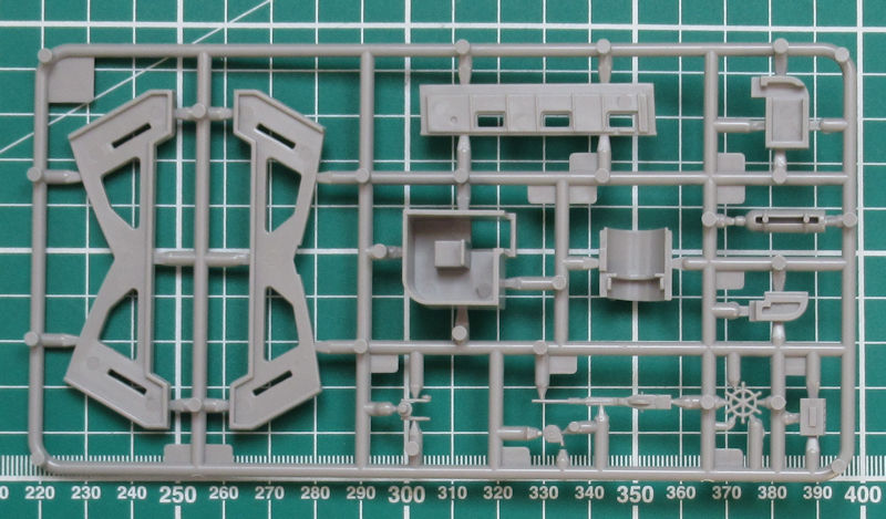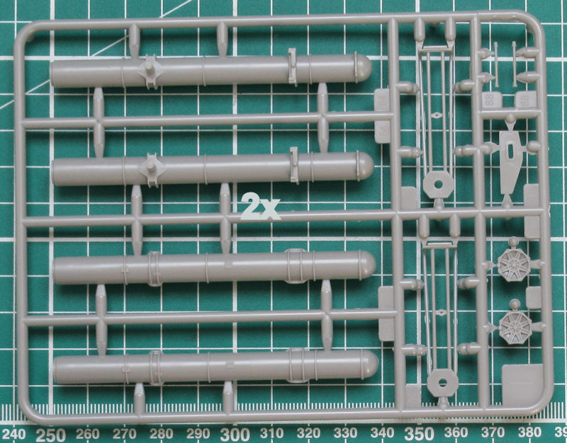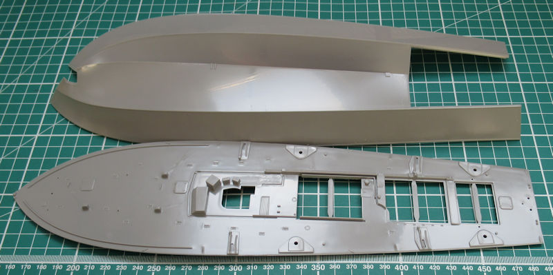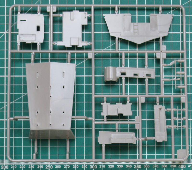 Unterm Rumpf werden die drei Schiffsschrauben statt Wellen und Halter angebracht. Am Heck werden die sechs Auspuffe samt Halter angebracht. Für die Aufbauten gibt es passende Klarsichtteile. Ansonsten sehen die Aufbauten sehr filigran aus und entsprechen voll dem Standard der heutigen Zeit.