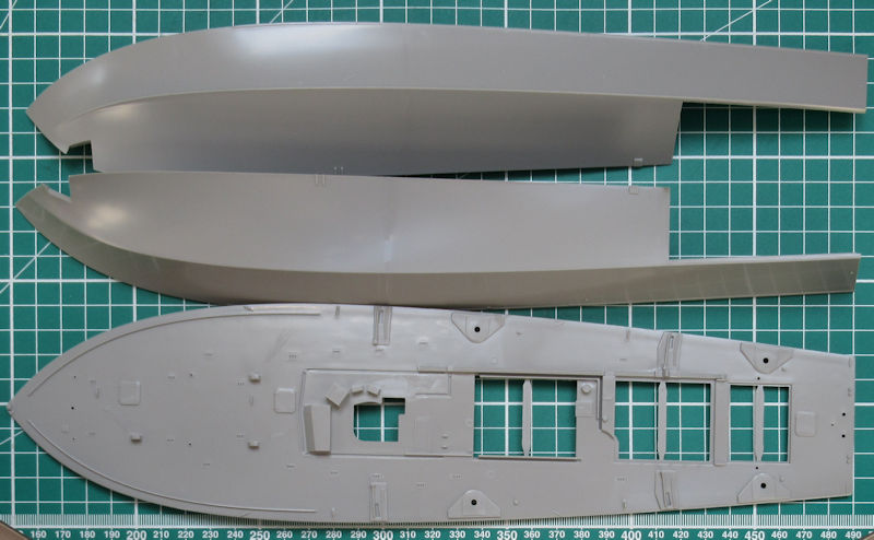 Im Vergleich zum alten PT-109 gibt es deutlich mehr Bauteile. Das geht schon beim Rumpf los. Man denkt offensichtlich an weitere Versionen. Ein deutlichen Unterschied im Vergleich zum alten Bausatz gibt es auch. Hier gibt es kein Holzdeck… Das Original hatte auch keines. Hier gilt er zum Beginn erstmal ein paar Bohrungen anzubringen. Dazu muss man sich in diesem frühen Stadium für einen Bauzustand des PT-109 entscheiden.