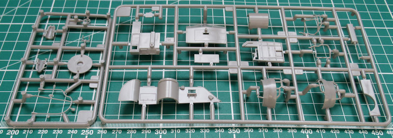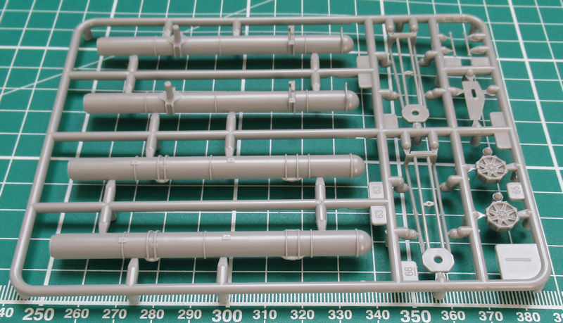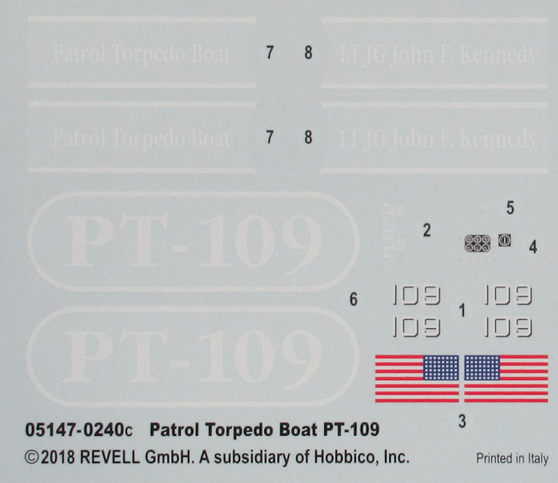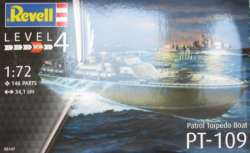 Bausatz: Schon 1963 zum passenden Film erschien 1963 das PT-109 in 1/72 bei Revell. 55 Jahre später gibt es einen neuen Bausatz des PT-109 im gleichem Maßstab. Im unpraktischen Stülpkarton befinden sich gut verpackt 15 graue Spritzgussrahmen bzw. Großbauteile mit 132 Teilen, drei klare Rahmen mit 14 Teilen, ein kleiner Decalbogen und die mehrfarbige Bau- und Bemalungsanleitung.