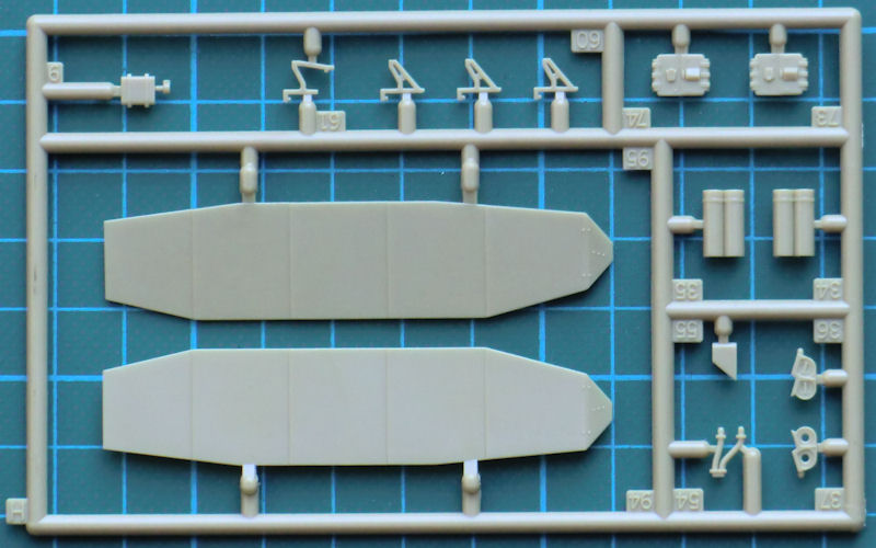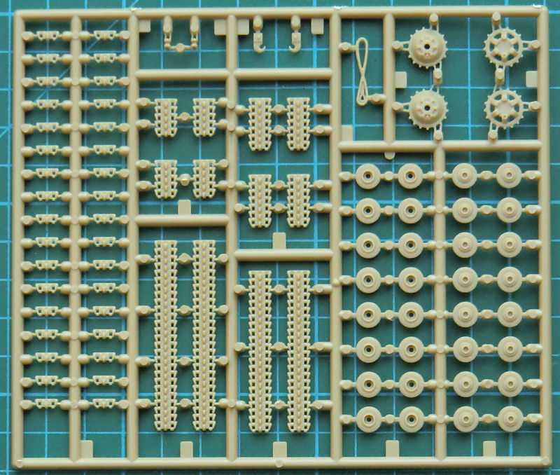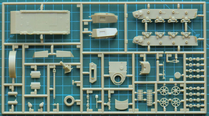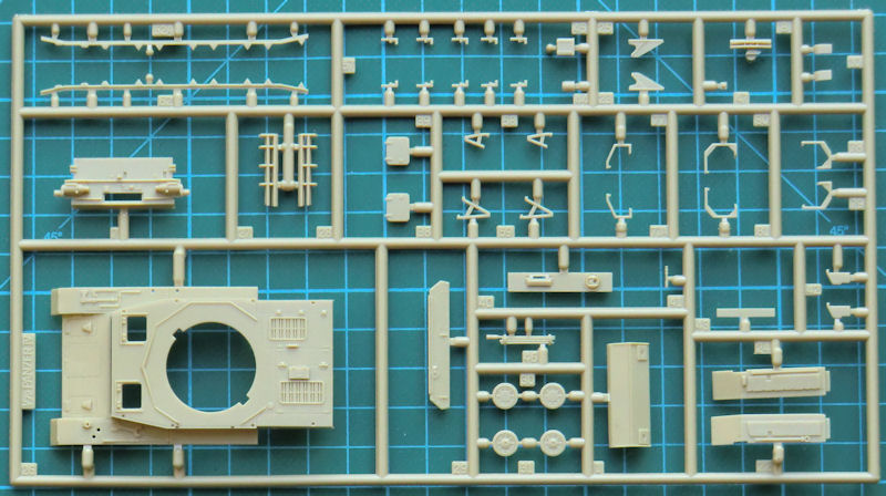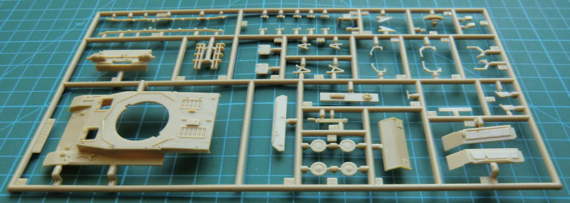 Die meisten Bauteile gehen für die Kette aus Segmenten drauf. Auch das Fahrwerk ist vorbildgerecht repliziert. Leider sind die Fahrwerksbeine fest angegossen. Dafür gibt es das Bordwerkzeug zumeist einzeln. Die Panzerwanne ist voll mit vorbildgerechten Strukturen und Details. Schön sind auch die einzelnen Lucken. Diese können dadurch in offener Position angeklebt werden.