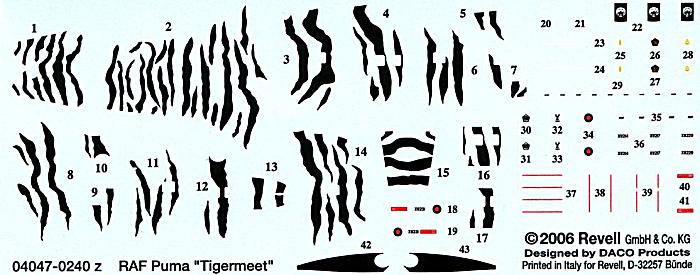 Die Decals sind für die RAF Sonderbemalung zum Tigermeet. Diese wurden von DACO gestaltet und beinhalten alles, was man braucht - eben auch die Tigerstreifen. Für die Inneneinrichtung / das Cockpit muss man selbst kreativ werden.