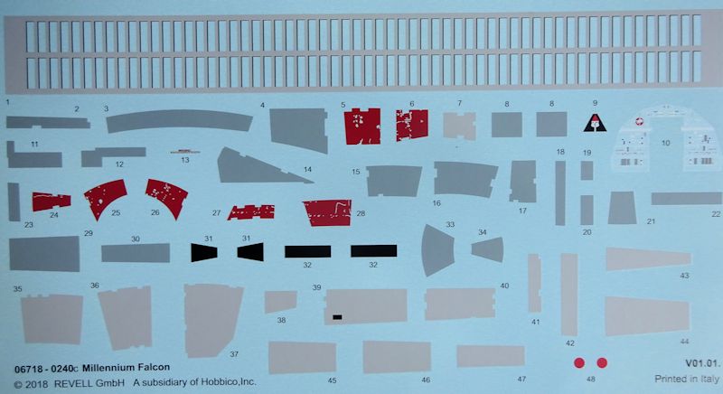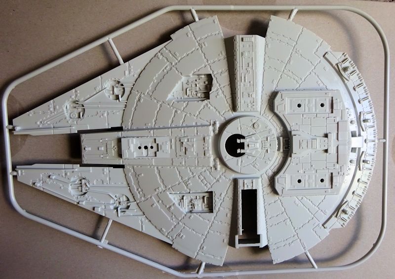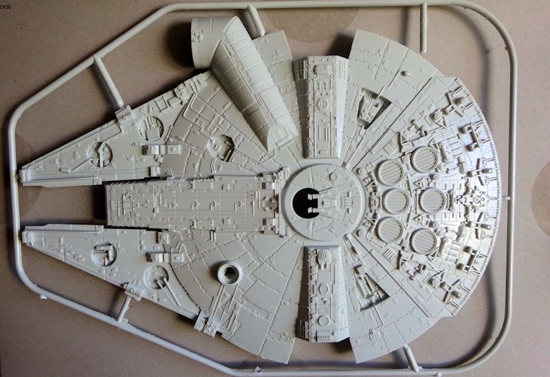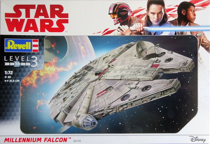 Bausatz: Der größte Millenium Falcon von Revell kommt in einem instabilen Karton daher. Mit 52 Teilen an fünf Gussästen ist er im Level 3 angesiedelt und soll damit für Modellbauer ab 10 Jahre einen unkomplizierten Spaß am Bauen und Bemalen bieten.