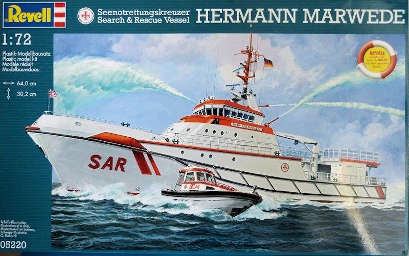 Bausatz: Der Bausatz des Seenotrettungskreuzers "Hermann Marwede" ist eine Wiederauflage. Revell ersetzte das ältere Beiboot durch das neue Festrumpfschlauboot, mit dem Namen "Verena". Das vorherige Boot bietet Revell separat als Bausatz Nr. 05214 "Walter Rose" an. Der sehr große Stülpkarton, weist schon auf die Dimensionen des Modells hin. Dafür braucht man schon etwas Platz in der Vitrine oder im Regal. Bis auf den Deckel ist der Karton relativ stabil.