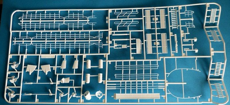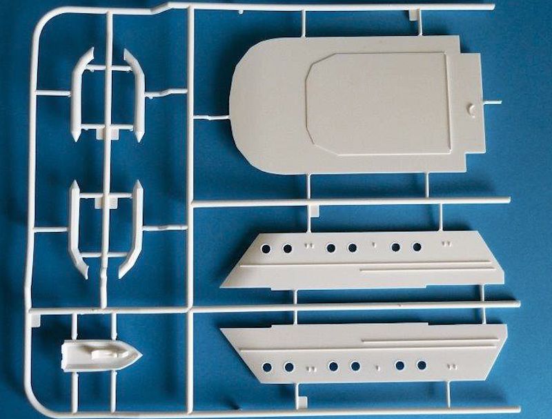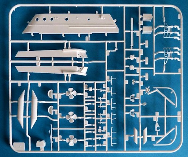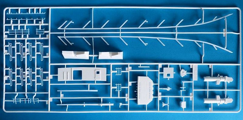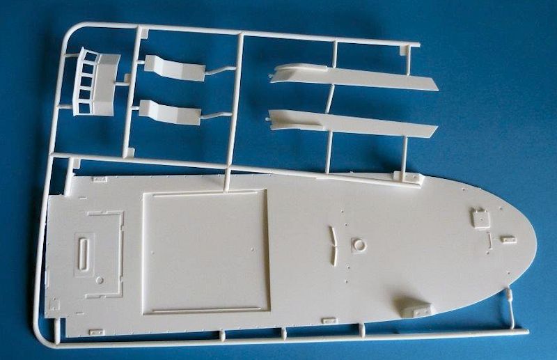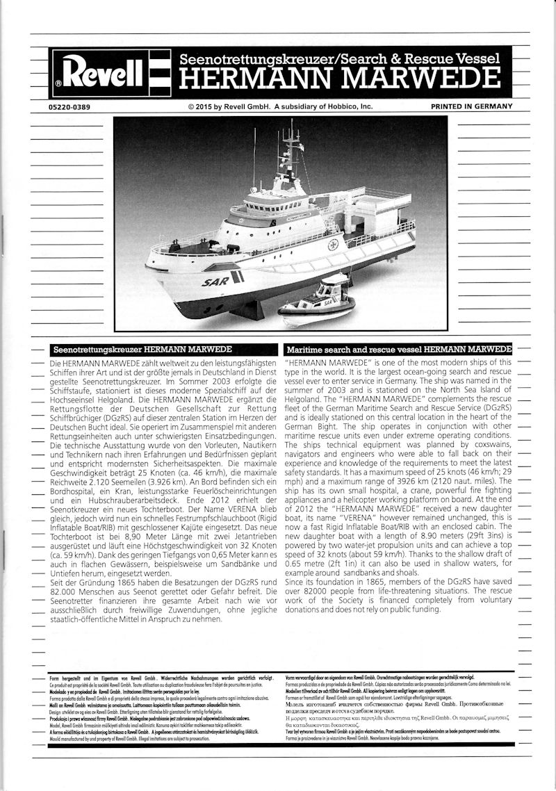 Nach dem Öffnen, fällt sofort der einteilige Rumpf ins Auge. Das ist von Vorteil, entfällt doch dadurch das Verkleben der beiden Rumpfhälften. Neun weiße Spritzlinge und zwei Gußäste aus Klarsichtmaterial liefern die notwendigen Kleinteile. Auch diese Spritzlinge haben eine spezielle, dem Maßstab geschuldete Größe. Alle 354 Bauteile sind gratfrei und die Detaillierung ist sehr ansprechend. Die Bauanleitung umfasst 24 Seiten. Jeder Bauabschnitt ist ausführlich erklärt. Für den Bau der "Herrmann Marwede" benötigt man allein 64 Bauabschnitte, dazu kommen 12 Kapitel für den Bau des Tochterbootes "Verena". Aufgrund der Teileanzahl und des Baulevels 5 sollte der Modellbauer eine gewisse Erfahrung mitbringen.