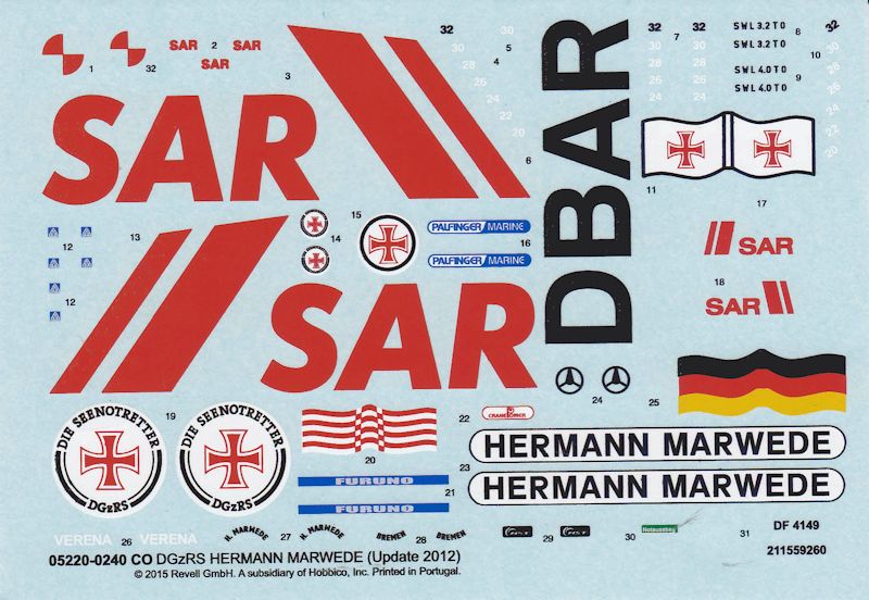 Bemalungsvarianten: Revell bezieht sich wie immer auf das eigene Farbprogramm. Hier kann man zwischen Email oder Aqua Color Farben wählen. Zwei Farben müssen gemischt werden. Der Decalbogen enthält für beide Boote hervorragende, glänzend gedruckte Decals die. Der Trägerfilm ist kaum zusehen.