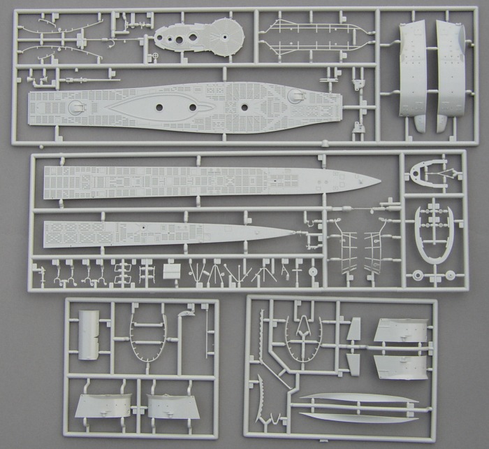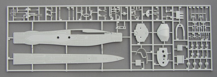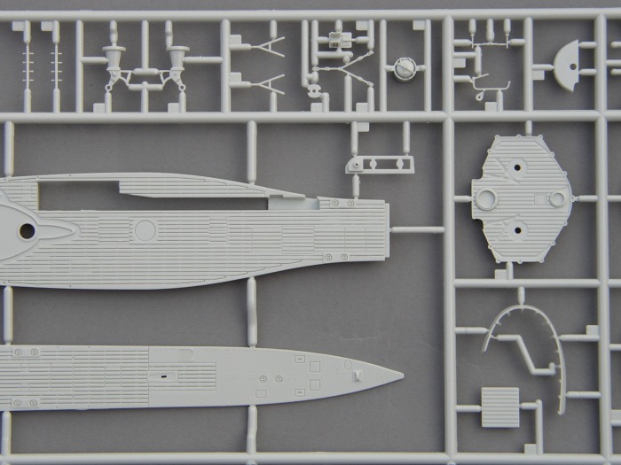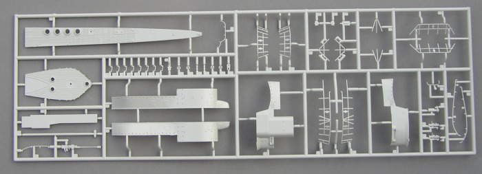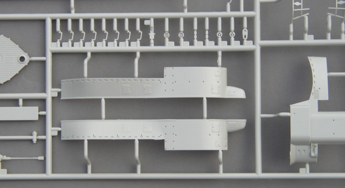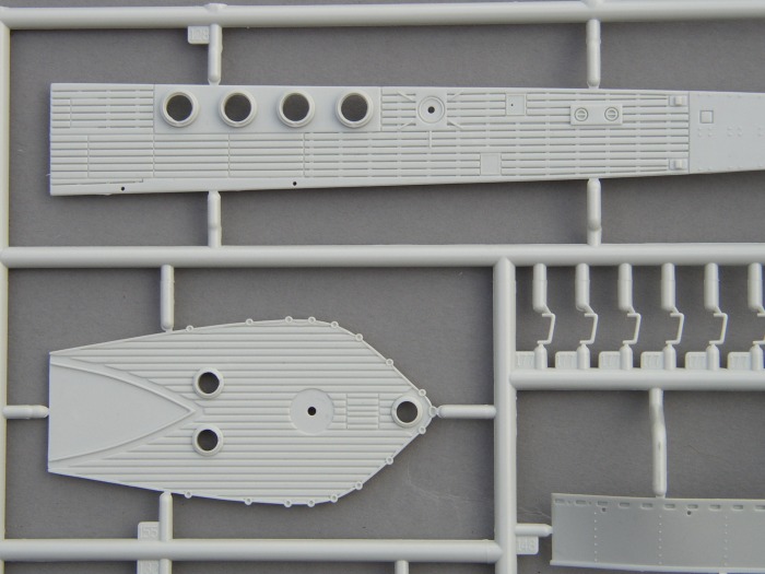Die größten Veränderungen des Bausatzes gab es auf dem Oberdeck. So wurden die beiden großen Spritzlinge komplett neu erstellt, denn was bei den beiden Versionen identisch ist, gibt es auf den vier kleinen Spritzlingen. Das Deck hat jetzt die Holzbeplankungen. Eine Holzmaserung ist nicht eingespritzt, da sie ja auch nicht maßstäblich wäre. Hier ist eine grundsolide Arbeit gemacht worden. Die Vorbilder dieses Bausatzes hatten eine Schnorchelanlage und somit gibt es diese auch im Bausatz. Der Boden des "Schnorchelfachs" hat die Auswerfermarkierungen auf der Oberseite. Alle anderen Auswerfermarkierungen sind schön auf den nicht sichtbaren Seiten angebracht worden. Da es sich hierbei um ein flaches Teil handelt, sind diese auch schnell zu entfernen.