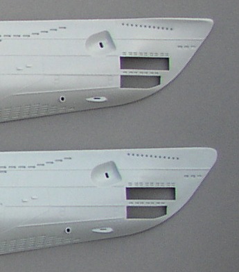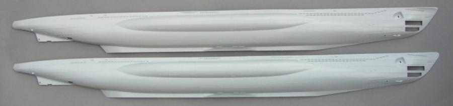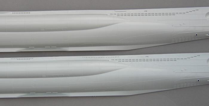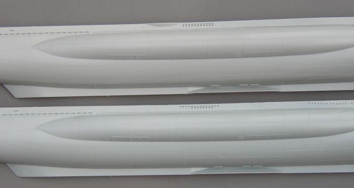 Genau das hat Revell im Modell nachgebildet! Der Rumpf ist ca. 1,8 mm länger und in der Draufsicht sieht man die Verbreiterung. Richtig deutlich werden die Unterschiede im Vergleich zum alten Rumpf (jeweils unten). Die Anordnung der Flutschlitze wurde auch dem Original angepasst. Für mich ist es nach wie vor erstaunlich, wie es Revell gelungen ist die beiden Rumpfhälften in dieser Länge so absolut ohne Verzug abzuspritzen! Meine beiden Hälften fallen förmlich zusammen!