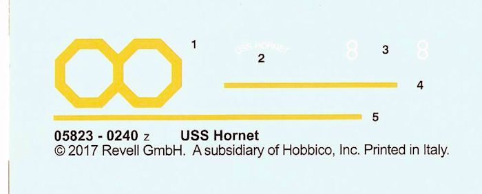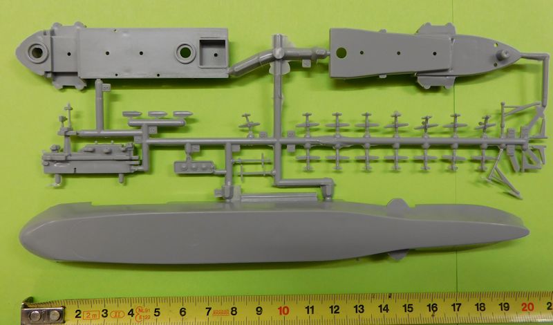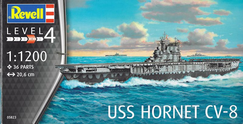 Bausatz: Revell erweitert seine 1/1200 Schiffsserie um den Flugzeugträger USS Hornet während des Doolittle Raid. Im revelltypischen Schüttkarton finden sich zwei graue Spritzlinge mit insgesamt 55 Bauteilen, wobei 35 Teile alleine die Flugzeuge ausmachen (16 Bomber und 19 Bordflugzeuge). Der Guss als solches geht soweit in Ordnung.