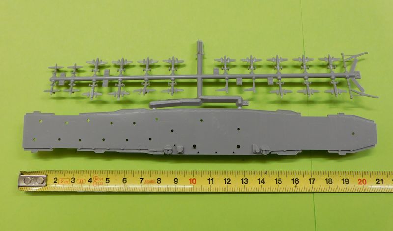 Bei diesem Maßstab kann man natürlich keine allzu hohe Detaillierung erwarten. Das Flugdeck weist leichte Gravuren der einzelnen Sektionen auf. Leider sind aber auch einige Sinkstellen, Schlieren und Kratzer zu sehen. Des Weiteren ist das Deck mit Löchern versehen, in die die Bomber gesteckt werden sollen. Damit ist nur eine Art der Platzierung der Flugzeuge möglich, es sei denn, man verspachtelt die Löcher!