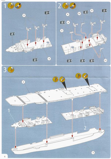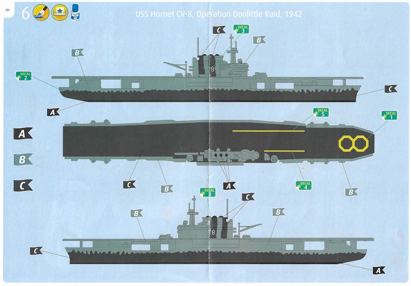 Bemalung: Die Bauanleitung besteht aus zwei beidseitig farbig bedruckten Blättern. Des Weiteren liegt ein kleiner, sauber gedruckter Decalbogen für das Flugdeck bei, den man aber eigentlich nicht nutzen sollte, da er historisch nicht korrekt ist. Das Bemalungsschema basiert auf den Farben von Revell, ist aber leider auch nicht korrekt.