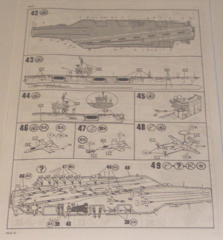 Die Decalbogen wurde von Revell neu entwickelt. Dies war notwendig, da der von Italeri nicht stimmig war. Hier ein großes Lob an die Firma aus Bünde für die Reaktion auf die Kritik. Der neue Bogen überzeugt in Form und Farbe. Die Hoheitzeichen für das Bordgeschwader wurde natürlich auch bedacht. Die Bauanleitung führt in 49 Stufen zum fast 46 cm langen, fertigen Modell. Allerdings sind einige Position von Plattformen etwas wage, hier sollte man auf den umfangreichen Fundus an Bildern im Internet zurückgreifen. Dies gilt auch für die Positionierung der Flugzeuge an Deck, die im Original nur scheinbar ein Chaos bildet. Für die Farbgebung muss diesmal "nur" das sog. Hazegrey, ein helleres Grau für den Aussenanstrich, angemischt werden.