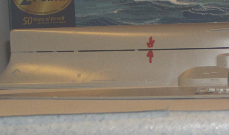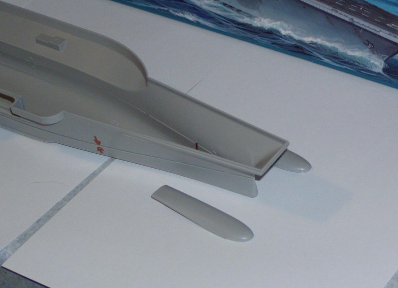 Das größte Teil im Bausatz ist natürlich der einteilige Rumpf. Dieser ist als Vollrumpf ausgeführt, wobei das dann auch gleich die erste Schwierigkeit mit sich bringt, vorausgesetzt man will keinen Waterliner. Das Teil hat noch die alte Form ohne den Wulstbug. Daher muss man laut Bauanleitung das "gesamte" Unterwasserschiff (Siehe rote Markierung!) abtrennen, den alten Bug lt. vorgebenen Maß entfernen und den neuen Bug anbringen. Das dürfte eine ziehmliche Spachtelorgie werden. Vielleicht sollte man nach einer einfacheren Lösung suchen, z.b. nur den Bug entfernen. Das nächste große Bauteil, was einen ins Auge sticht, ist der Spritzling mit dem Flugdeck. Dieser stammt aus den alten Bausätzen. Hier fallen die erhabenen Gravuren auf. Anfänger habe sicherlich damit keine Probleme, Profis können die Markierungen für den Flugbetrieb abschleifen. Zwei Flugzeugaufzüge können abgesenkt dargestellt werden. Der Raum unter dem Flugdeck bleibt frei, es leigt kein Hangardeck bei. Das geht sicherlich im Hinblick auf die Kosten in Ordnung. Der Gussast mit der Wasserliniengrundplatte stammt auch noch aus der alten Auflage, hier werden auch zahlreiche Teile nicht benötigt. Um die neuste Version bauen zu könnnen, wurden dem Kit zwei neue Spritzlinge beigelegt.Diese beinhalten einmal neue Teile für die Insel und den Mast, andere Plattformen, den Wulstbug, einen neuen Tilly-Kran und, sehr gut, die Anlegeplattform für Verkehrsboote am Heck des Schiffes. Neu sind auch die Flugzeuge, denn grundsätzlich wird es ja nur noch Hornet oder Super Hornets geben. Allerdings gibt es momentan auch noch eine Staffel EA-6 Prowlers, diese ist nicht berücksichtigt. Auch werden keine Unterschiede zwischen den beiden Hornetvarianten gemacht. Hier kann jeder ja noch nach eignen Gusto auf Angebote von anderen Herstellern ausweichen.