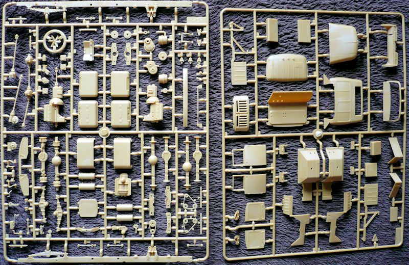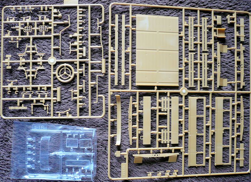 Bausatz: Der Bausatz besteht aus 229 Bauteilen, verteilt auf 7 Spritzlinge, verfügt über einen Spritzling mit acht Vinylreifen und einem Abziehbilderbogen. Der Bausatz hat seine Ursprünge bei der Firma ICM und somit schon einen gewissen Bekanntheitsgrad. Die Bauteile weisen detaillierte Oberflächen mit feinen Gravuren auf. Das Chassis und das Fahrwerk sind ebenfalls gut detailliert. Ein gut reproduzierter Motor und ein authentischer Innenraum runden das alles noch ab. Das Fahrzeug wir mit einer offenen Pritsche geliefert. Die 16 seitige Bauanleitung führt einfach und übersichtlich durch 84 Bauabschnitte.