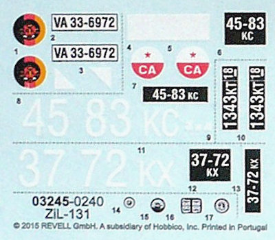 Bemalung: Die Bemalungsanleitung, bezogen auf das Farbensortiment von Revell, gibt 4 darstellbare ZiL-131 an. Die Abziehbilder sind sauber und randscharf gedruckt, wobei die der NVA mir persönlich nicht so gefallen. Darstellbare Versionen: