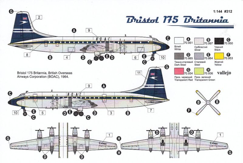 Vorbild: Die Bristol Type 175 Britannia war ein in den Jahren 1952 bis 1959 von der britischen Bristol Aeroplane Company gebautes Langstreckenflugzeug für den zivilen und militärischen Einsatz. Angetrieben wurde es von vier Turboprop-Triebwerken Bristol Proteus, die im eigenen Unternehmen entwickelt worden waren. Es wurden 85 Exemplare gebaut, die teilweise bis in die 1990er Jahre im Einsatz blieben.