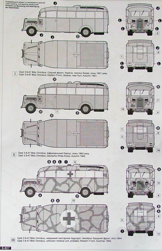 Bemalung: Der Bemalungshinweis erfolgt auf der letzten Bauplanseite in schwarz/weiß. Es liegen Decals für drei Versionen vor. Ein Fahrzeug von der Ostfront, ein Fahrzeug des deutsche Afrika Korps und ein Sanitätsfahrzeug von der Westfront.