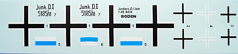 Der Abziehbildbogen ist recht spartanisch und ermöglicht die Markierung von 2 Flugzeugen. Die Nassschiebebilder sind wirklich weiß und scharf, ich habe aber leider keine guten Erfahrungen mit Decals von Roden. Diese waren bisher immer seeeehr spröde und die Wellblechstruktur wird hier ein Übriges tun. Man sollte also den Erwerb von Zubehörprodukten erwägen (falls es denn welche geben wird) oder die Markierungen maskieren und spritzen - so viele sind es ja nicht.