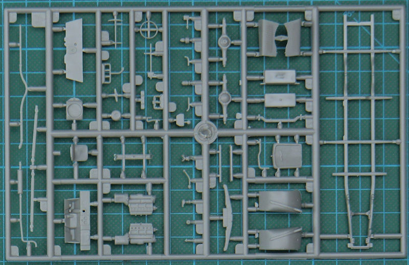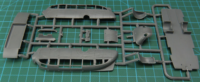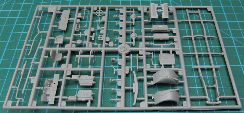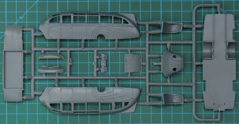 Das Modell erhält sogar einen Motor samt Lüfter, Lichtmaschine und Kühler. Weiterhin gibt es ein recht detailliertes Fahrgestell sowie ein Ersatzrad. Natürlich geht es im Fahrgastraum auch recht ordentlich weiter. So sind die Einzelsitze und ein detaillierter Fahrerplatz vorhanden. Die Verglasung der Fenster soll aus einem beiliegenden Fotofilm entstehen.