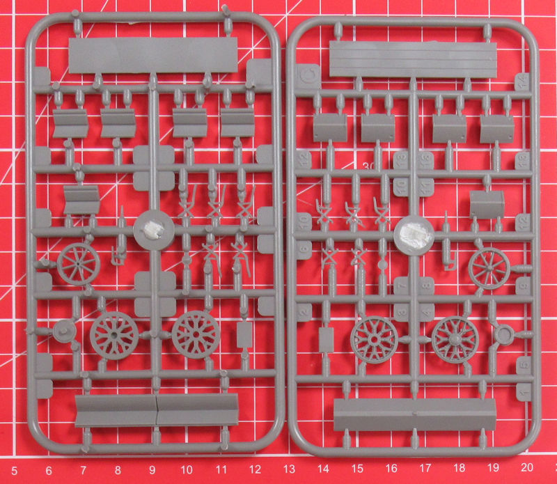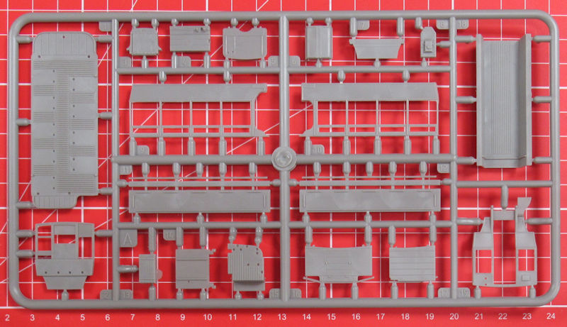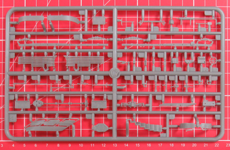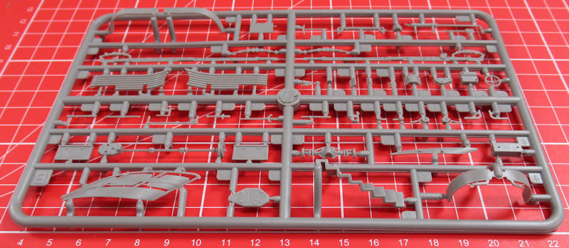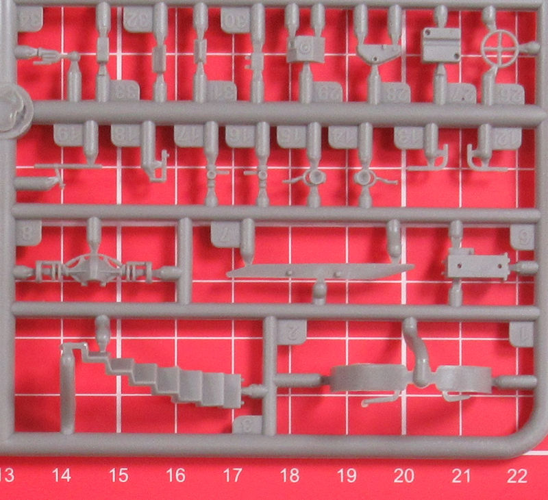 In der attraktiven aber unpraktischen Schüttbox befinden sich gut verpackt vier hellgraue Spritzgussrahmen mit 103 Teilen, ein Bogen mit klarer Folie, ein Decalbogen, ein Papierbogen und die übersichtliche Bauanleitung. Die Abspritzung der Teile ist sehr gut und auch die Detaillierung ist voll auf der Höhe der Zeit.