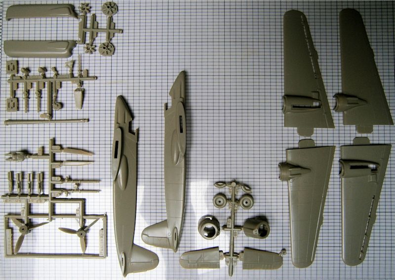 Bausatz: Die Teile dieses Plastikmodells entstammen Airfix-Gussformen. In der Schachtel, deren Deckel eine Boxart von Arkadiusz Wrobel ziert, befinden sich 43 gelbgraue sowie ein transparentes Teil für die Kanzelverglasung. Ähnelt deren Gestaltung vordergründig dem nur wenige Jahre älteren Lindberg-Kit, bemühte sich Airfix hier redlich noch etwas authentischer zu sein. Die Darstellung der Außenhaut kommt daher bereits völlig ohne Nietenreihen aus. Auch sonst braucht die Nachbildung der Oberflächendetails den Vergleich mit der Dreiseiten-Zeichnung nicht zu scheuen.