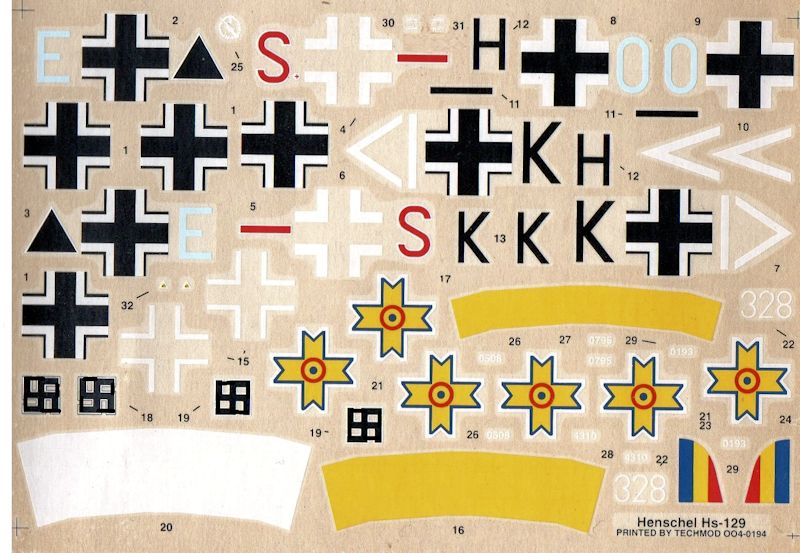 Doch wie sieht es mit den Vorbildmaschinen aus, die sich damit erstellen lassen sollen? Da schoss SK Model effektiv über das Ziel hinaus! Hatte Airfix neben dem "Fliegenden Büchsenöffner" einst durch die Mitlieferung von Rumpf-ETCs samt vier SC 50 Bomben auch noch die Möglichkeit zum Bau einer Hs 129 B-2 R geschaffen. Wählten die Danziger fahrlässigerweise zwei Vorbilder aus, die in Wirklichkeit anstatt der Bomben eine Kanonenbewaffnung hatten. Dies wäre zum einen die blaue "E", bei welcher der Lauf einer Maschinenkanone ja schon auf dem Deckelbild erkennbar ist. Auch die blaue "O" war erwiesenermaßen mit einer MK 101 ausgestattet! Die rote "S" hingegen flog weder mit dieser noch der MK 103 und wäre somit korrekt. Was man letztendlich auch von der rumänischen Maschine behaupten kann. Nur deren gelb angemalte Bugspitze und das RLM-identische Splitter-Tarnschema sind hier als Kritikpunkt anzuführen. Wobei dies wohl eher Mr. Richard Ward anzulasten ist. War er es doch, der die Seitenrisse für die altehrwürdige Profiles-Publication Broschüre zeichnete, welche den Polen als Vorlage gedient haben muss. Demgegenüber dürfte das in Libyen eingesetzte Flugzeug offensichtlich anhand eines Profiles von Richard J. Caruana auserwählt worden sein. Wobei der Malteser bis auf die B-3 mit ihrer BK 7,5cm, interessanterweise, just auch gleich alle anderen anhand der beiliegenden Nassschiebebilder zu bauenden Vorbilder porträtierte. Nichtsdestotrotz sollte sich der auf höchstmögliche Authentizität bedachte die Zeit nehmen das genaue Aussehen mithilfe von Fotografien nachzuprüfen. Leider dürft das aber etwas schwierig werden, weil man zumindest meinen Kenntnisstand nach nicht für alle Maschinen beweiskräftiges Bildmaterial finden wird.