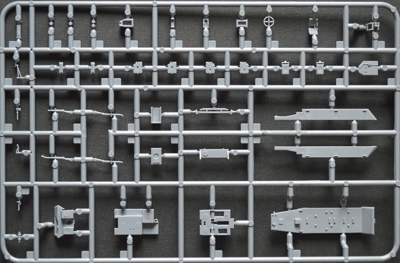 Im typischen Faltkarton mit attraktivem Cover sind vier Spritzgussrahmen, ein kleiner Ätzteilbogen, die Decals und Bauanleitung enthalten. Die Bauteile sind aus grauem und sandgelbem Plastik gespritzt. Da der Karton recht klein für die Menge an Spritzgussrahmen ist, kann es hier leicht zu Beschädigungen kommen. In meinem Fall ist die am Heck befindliche Panzerplatte neben dem Einstieg gebrochen, in einer anderen Bausatzvorstellung war es die Oberwanne. Immerhin sind diese Teile noch leicht zu reparieren. Ansonsten ist der Guss sauber und weist keine Fischhäute auf. Im Kampfraum befinden sich ein paar Sinkstellen und Auswerfermarken, welche später zwar schwer einsehbar sind, aber trotzdem ein paar Nacharbeiten erfordern. Auch an den Ketten sind Auswerfermarken, die aber verhältnismäßig einfach zu entfernen oder mit Schlamm/Schnee zu kaschieren sind. Die Detaillierung ist für diesen Maßstab gut und vor allem deutlich ausgeprägt.