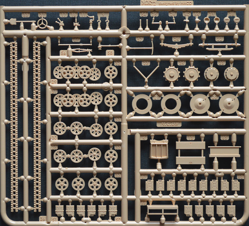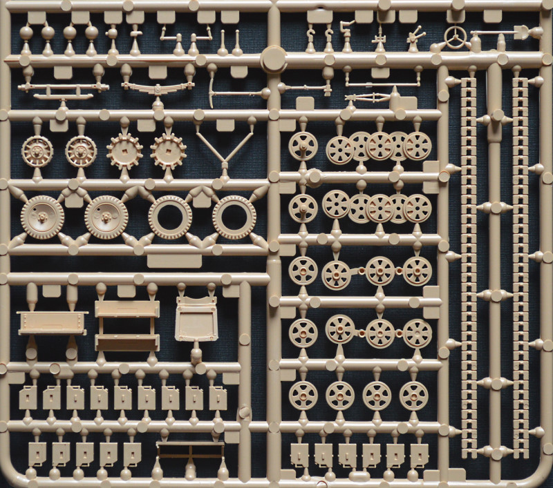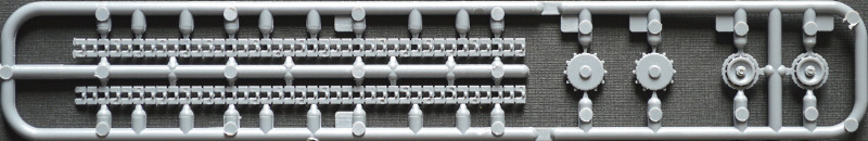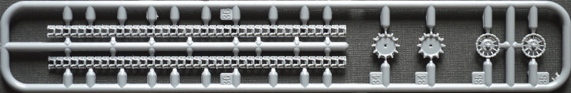 Der Bau beginnt mit dem Laufwerk und der unteren Wanne. Die Wanne wird aus mehreren Teilen zusammengeklebt (kein Slide Mold) und die Arme der Drehstäbe sind bereits angegossen. Auch die meisten Laufrollen sind bereits zusammengefasst, allerdings werden vorne einzelne Rollen angebracht, so dass der Gesamteindruck des Laufwerks nicht geschmälert wird - im Gegensatz zu Komplettlaufwerken, wie man sie von manch fernöstlichen Herstellern kennt. Die Ketten und Triebräder sind die Teile, die bereits in Zusammenarbeit zwischen MK 72 und CMK verbessert wurden und somit in zwei unterschiedlich gut detaillierten Versionen beiliegen. Die Ketten sind als kompletter Strang vorhanden und sollen geknickt werden. Da sie überlang sind, kann ein Kettendurchhang leicht dargestellt werden und es bleiben ein paar Einzelglieder übrig, die entweder in die Restekiste wandern oder auch auf dem Fahrzeug befestigt werden können - so wie man es bei Wehrmachtsfahrzeugen oft beobachten konnte. Der vordere Fahrwerksteil weist eine fein detaillierte Aufhängung mit Blattfederung für die Räder auf. Letztere bestehen aus je zwei Teilen und weisen ein akzeptables Profil auf.