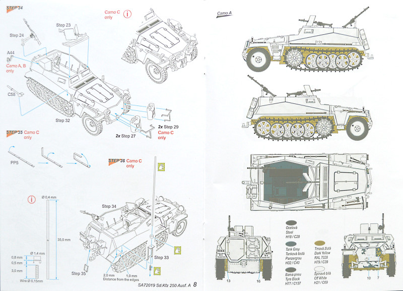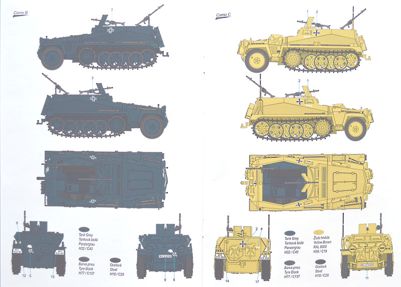 Die Anleitung ist übersichtlich und farblich gestaltet. Auf Optionen und kleinere Details wird sehr gut eingegangen. Im Gegensatz zum älteren Bausatz sind jetzt nur noch drei Bemalungsvarianten vorhanden, wovon das Fahrzeug der 16. PzDiv in Wintertarn bereits von MK 72 bekannt ist. Die Vorbilder werden auf einer extra Seite ausführlich erklärt - sehr löblich! Die Decals sind sauber und versatzfrei gedruckt.